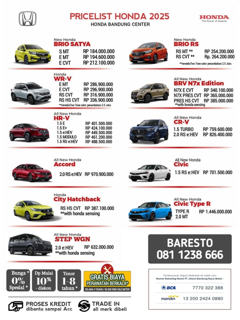 Kredit Syariah - Bunga Mulai 0% - DP & Angsuran Termurah - Tenor S/d 8 Tahun - Tukar Tambah Semua Merk & Tahun - Proses Mudah & Cepat - Diskon & Bonus Spesial - Kredit Paling Murah se-Kota Bandung - Free Jasa Perawatan Berkala, Oli & Sparepart 4Th/50.000Km, Free Kaca Film Full, Karpet Seat, Ompang + STCK, Dompet Kunci, Dudukan Plat Nomor, Alat Pemadam Kebakaran, Tools Kit + Segitiga Pengaman + P3K + Payung Dll. Buktikan Murahnya, Promo Honda Juara & Terbaik Bandung.